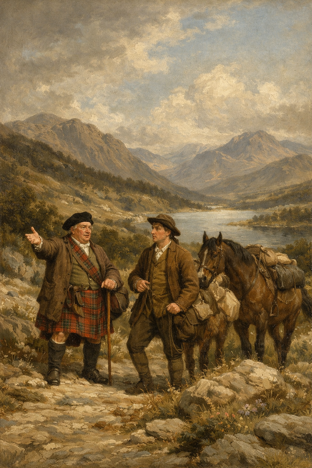 My first extract is from Rob Roy. It is a passage describing a journey north from Glasgow to the Highlands by Baillie Nichol Jarvie and he is accompanied amongst others by Andrew Fairservice, a groom or master of the stables, whom had been working in England and had recently seized the chance to come back to Scotland.