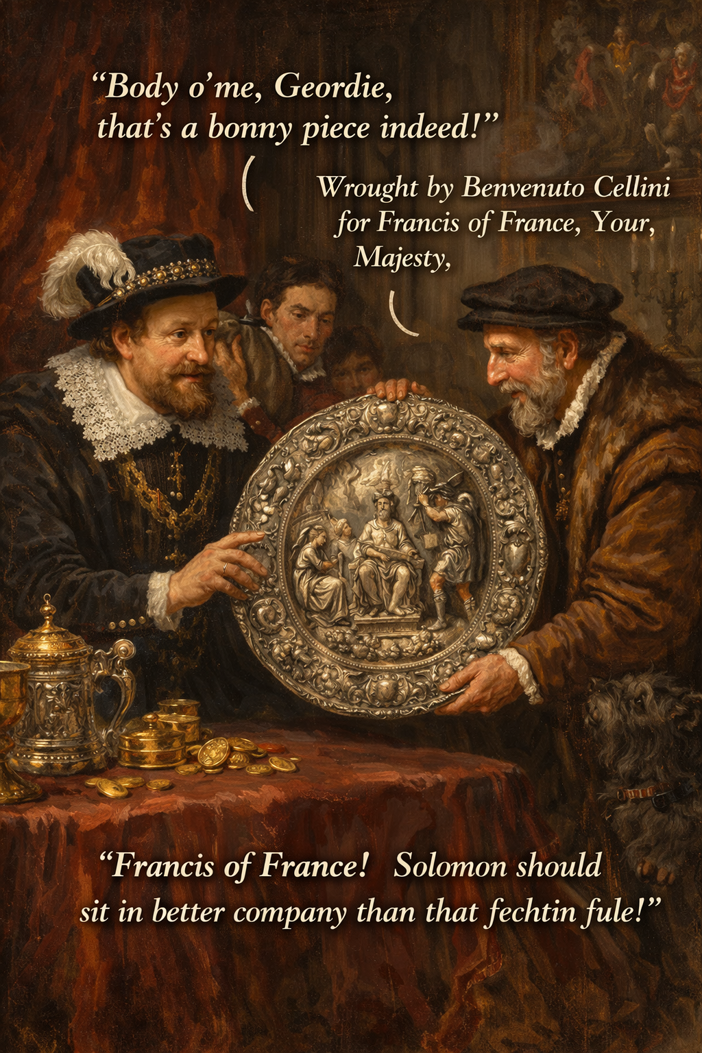 The passage selected from The Fortunes of Nigel Chapter 5 features an encounter between King James VI and I, and his jeweller, George Heriot. Scott's novel offers the chief, if not the only, fictional representation of Heriot in Scottish Literature, and was therefore felt to be an appropriate choice for pupils of the school which bears his name. Indeed, it was to a large extent due to the financial acumen which Heriot displayed in his business with the King - and of which we gain a flavour in the extract chosen - that he was able to accumulate the very substantial sums which he left for the founding of the school.