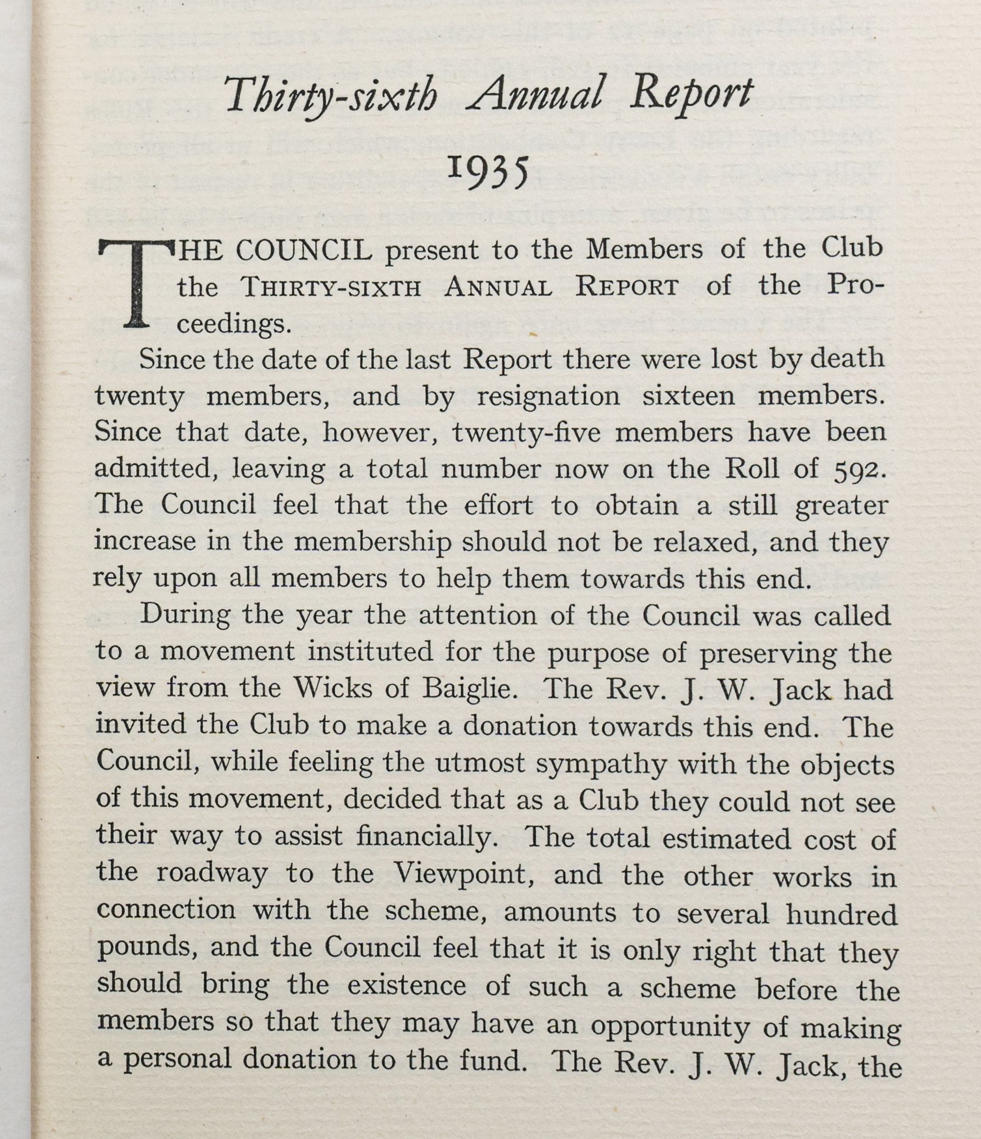The initiative appears to have been associated with the Rev. J. W. Jack, who had written on the subject in 1933. That same year he published a booklet titled Scott’s View from the Wicks of Baiglie, discussing the roads and the viewpoint.