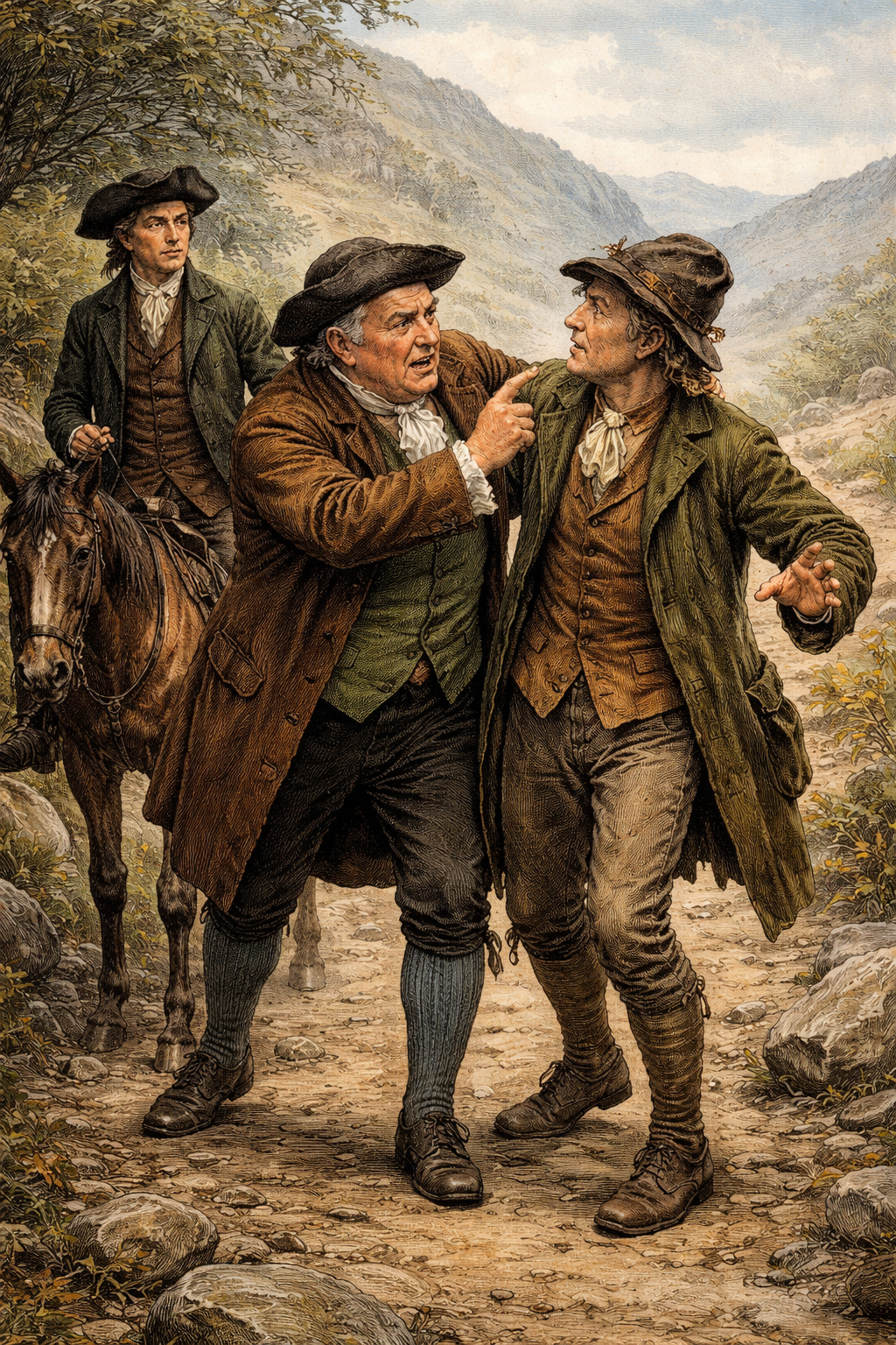 In this passage from Rob Roy - Frank Osbaldistone, Bailie Nicol Jarvie and Andrew Fairservice are on their way into the Highlands near Loch Lomond to meet with Rob Roy himself. Baillie Nicol Jarvie and Andrew Fairservice cannot abide each other.