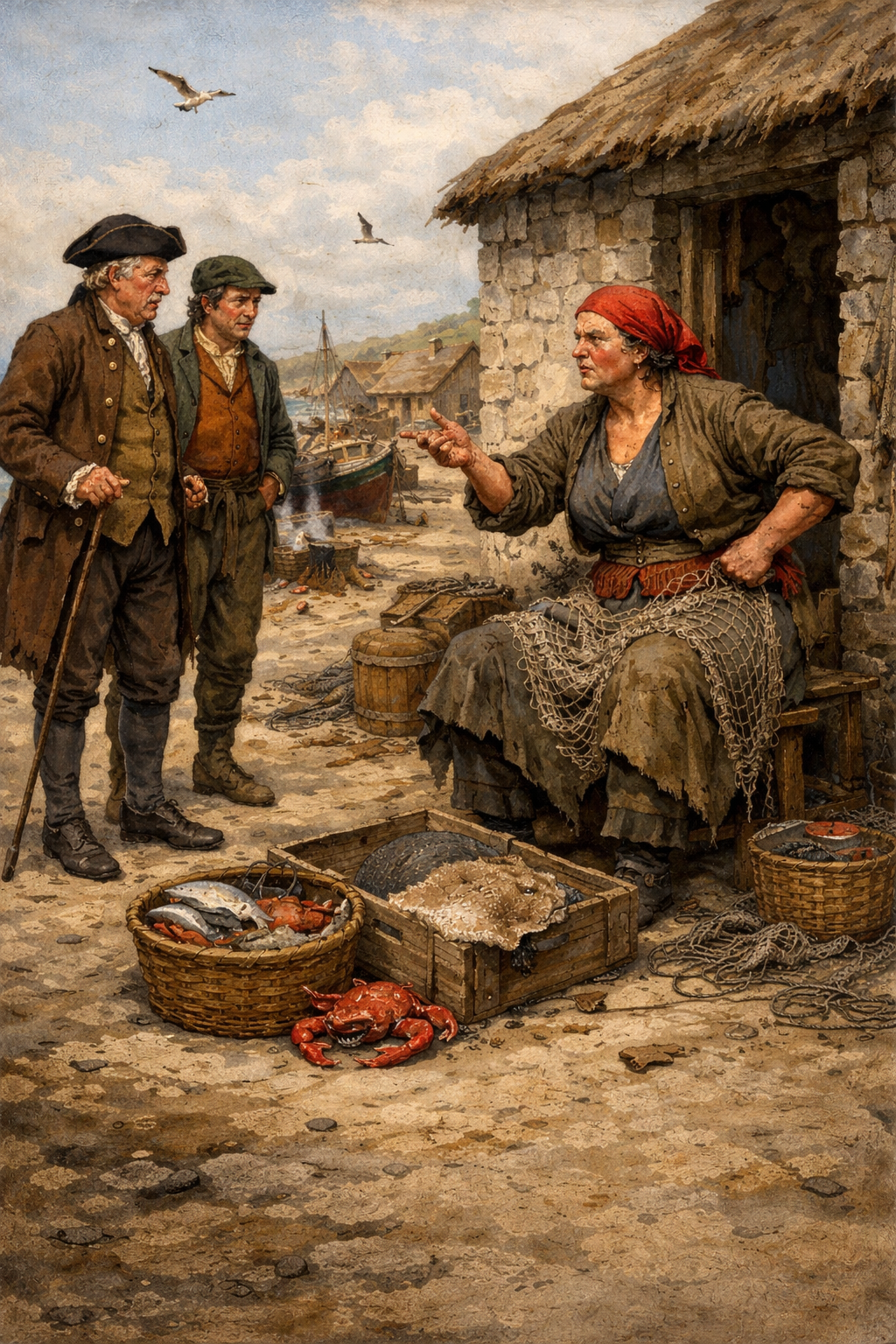 The passage comes from The Antiquary (1816), a novel set in July and August 1794. In it Jonathan Oldbuck, the Antiquary of the title, bargains with Maggie Meiklebackit for the purchase of fish. The two speakers are characterised by their forms of speech, Oldbuck uttering something rather more educated than Maggie, and yet both accommodating each other, adjusting what they say and how they say it. They represent different class attitudes to work and remuneration: 'It's no fish ye're buying—it's men's lives'. The gender difference is also a factor in their bargaining, for Oldbuck is rather more generous to Maggie than his sister would have been. Their respective views of drink illuminate a divergence in both their class and their religious perspectives. Yet the reference to the government's banning of whisky distilling brings in a political context which silently unites them in a kind of opposition to the British government. Though they differ, Maggie's views do not challenge Oldbuck's social position as laird, and Oldbuck's acceptance of his social responsibilities result in his paying Maggie half-a-crown for a couple of fish and some crabs when the average daily male agricultural wage in the county of Angus in 1794 was under 1s. It is brilliant dialogue: the argument moves to and fro, and, as it does, Oldbuck is uncovered as naive and generous, ignorant and wise, while Maggie's rhetoric has great moral force.