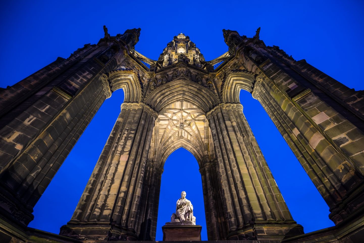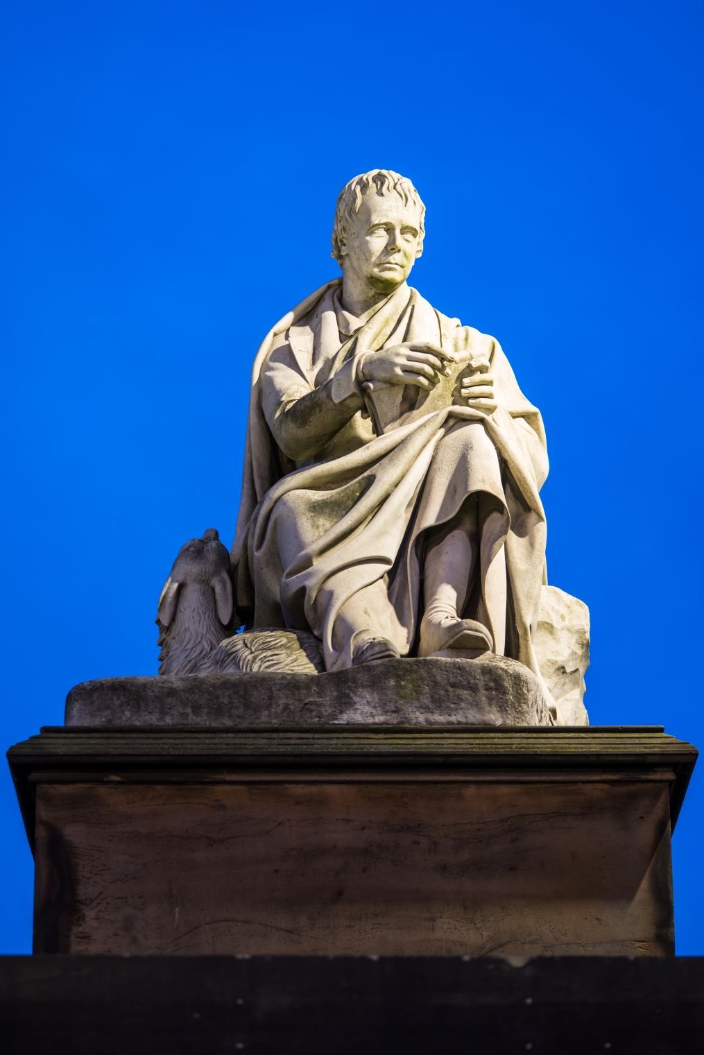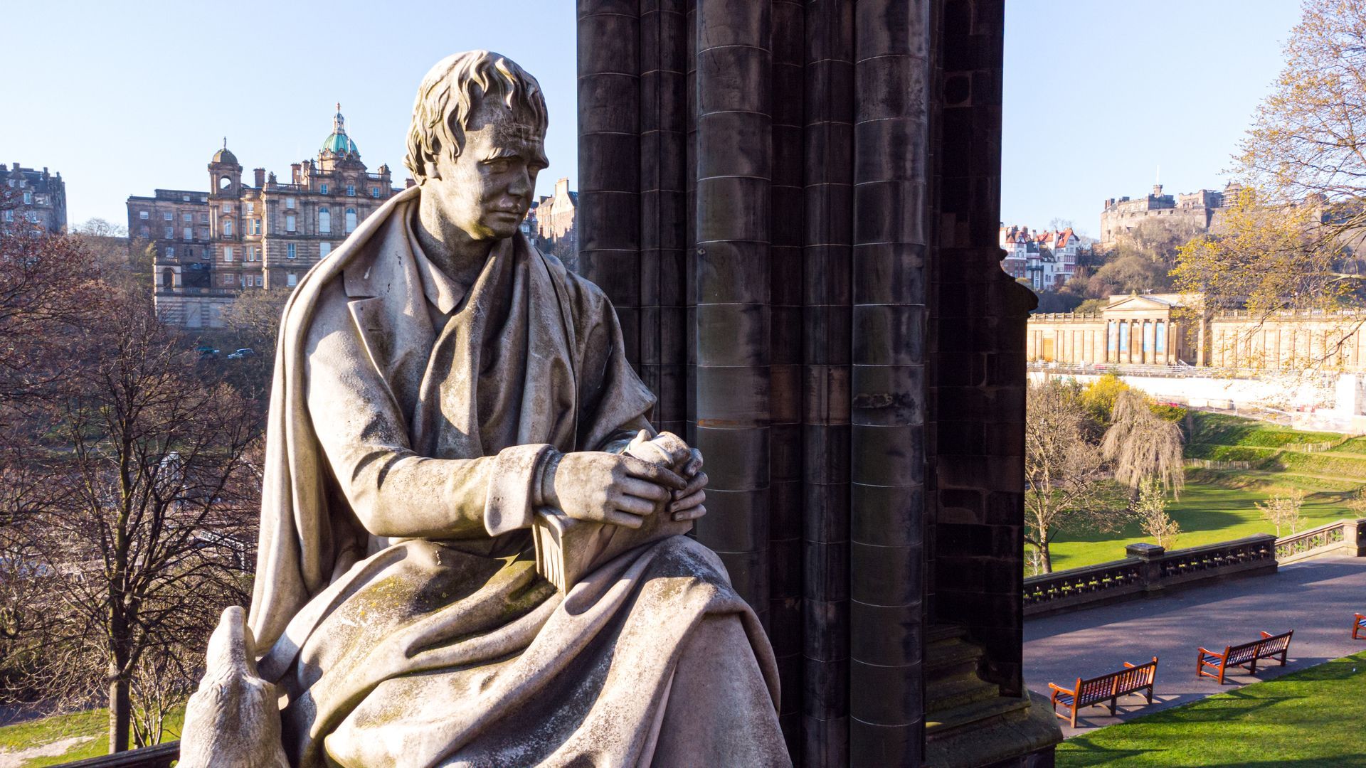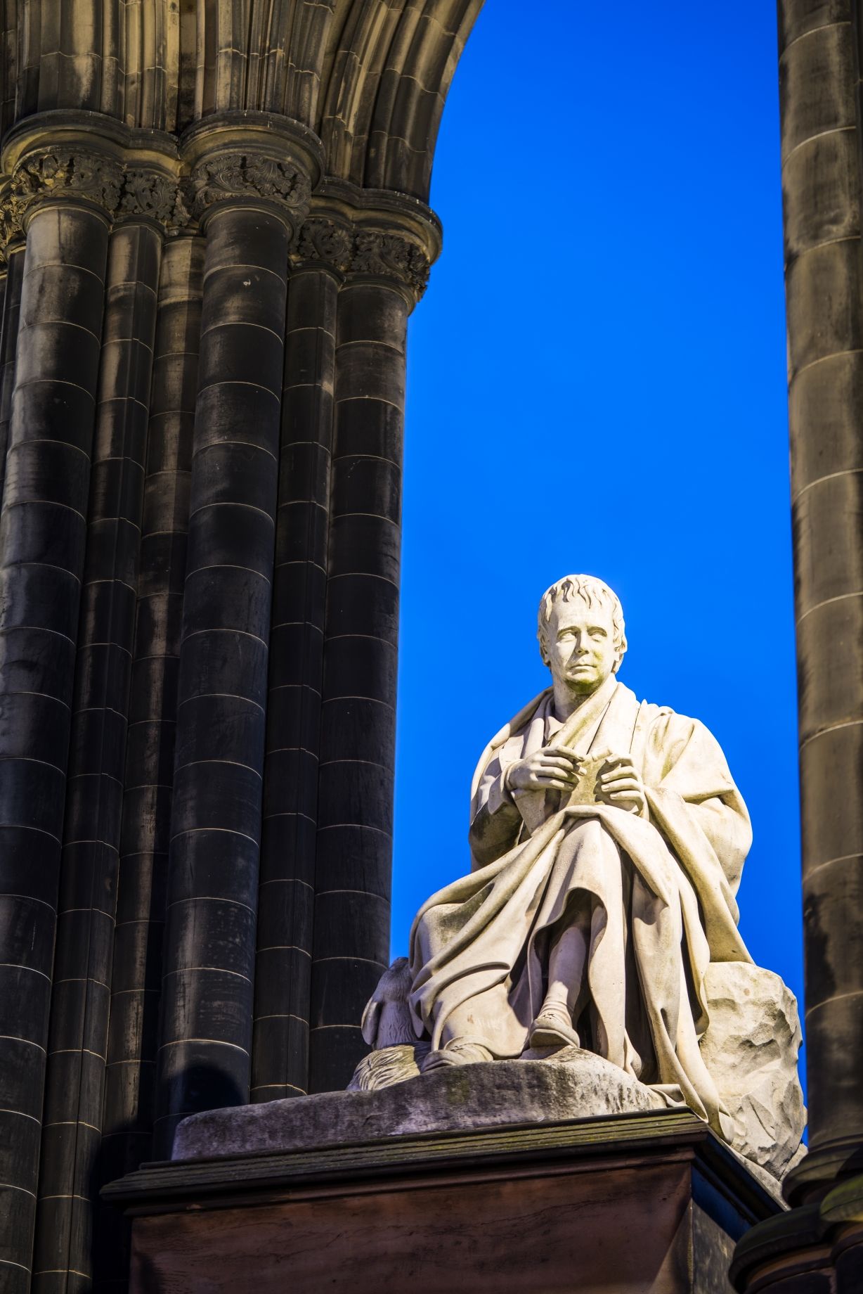Within its canopy sits a marble statue of Scott, carved by Sir John Steell, with his deerhound Maida at his feet.